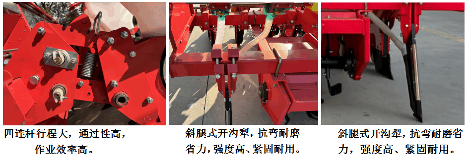 6、地輪采用單臂設計,有效避免纏繞、擁堵,各行傳動軸連成一體,統(tǒng)一驅動,傳動動力大,即使其中一側地輪偶然打滑也不影響正常播種:播種單體采用仿形設計,可隨地面上下浮動、可實現(xiàn)播深一致。