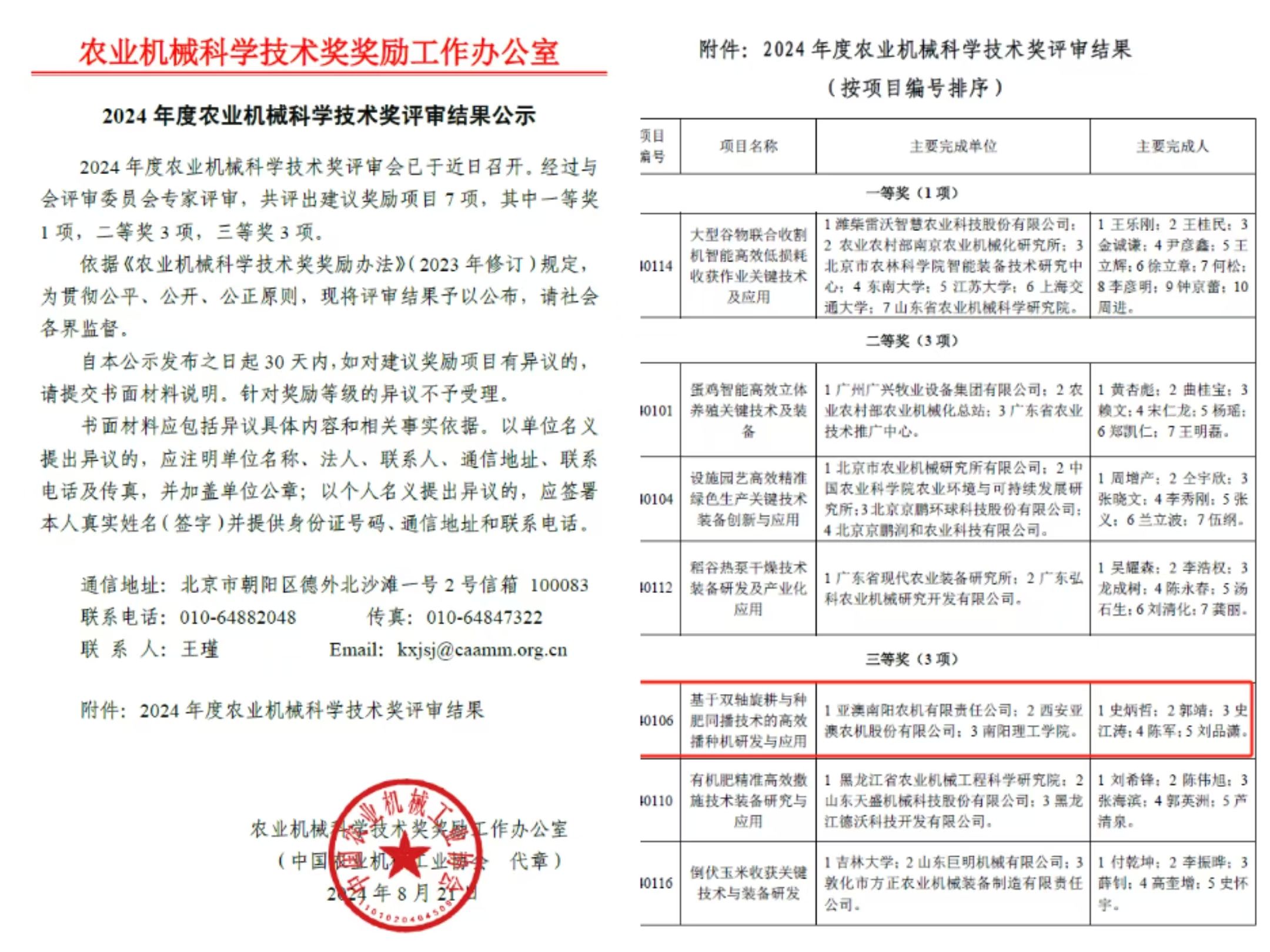 在科技與農(nóng)業(yè)深度融合的時代浪潮中,一則振奮人心的喜訊傳來 ——亞澳農(nóng)機成功榮獲農(nóng)業(yè)機械科學(xué)技術(shù)獎!